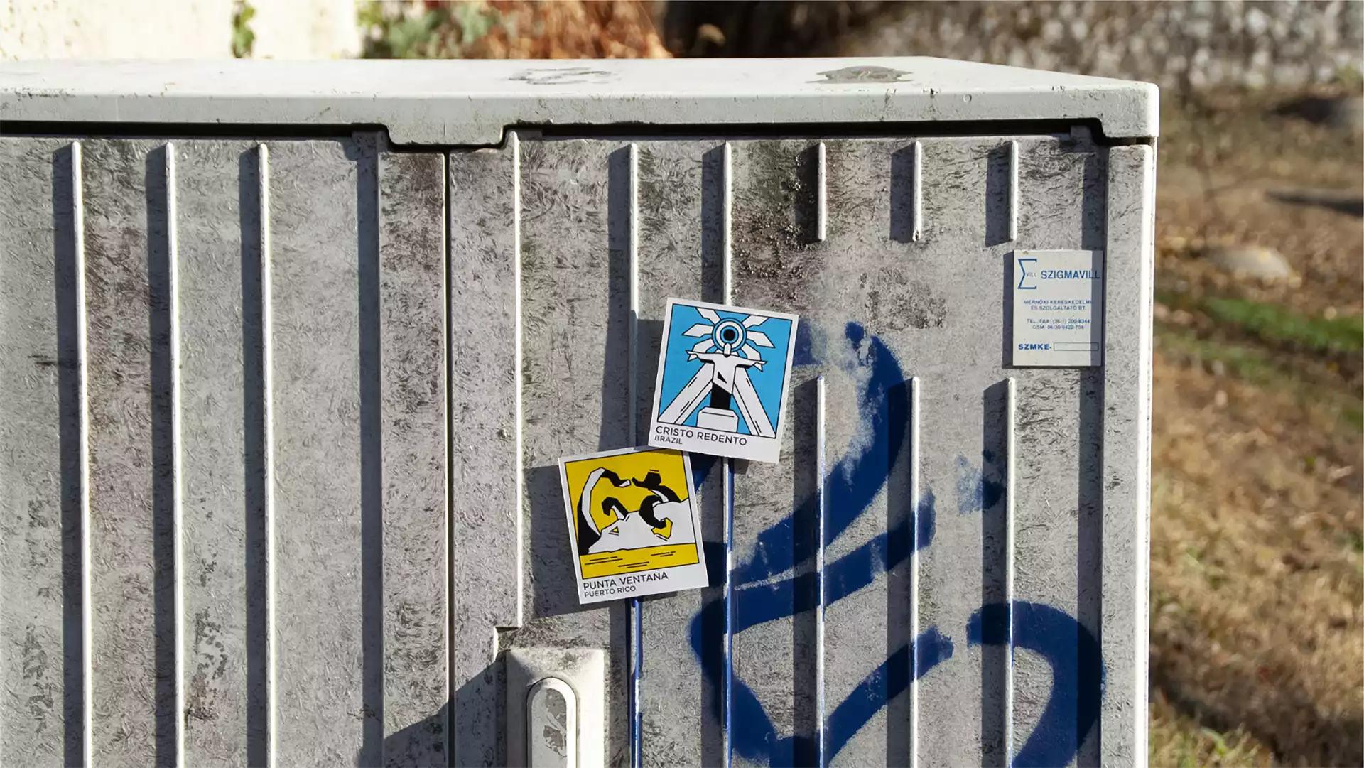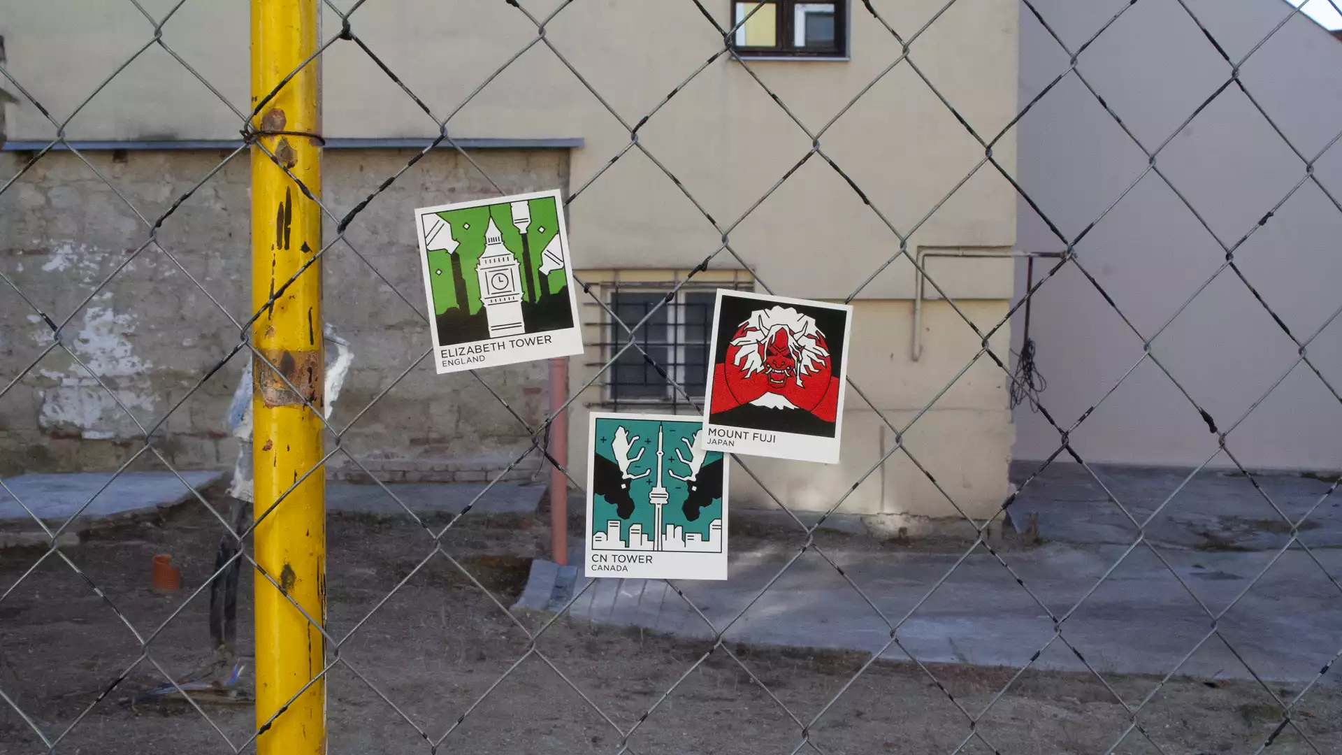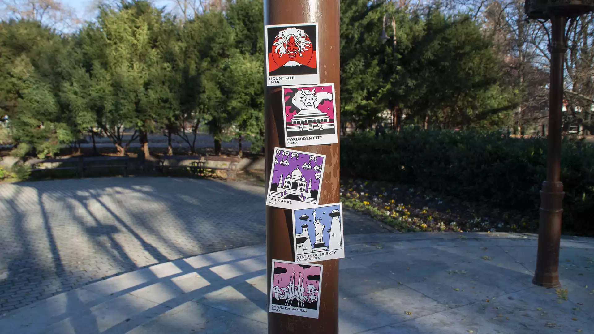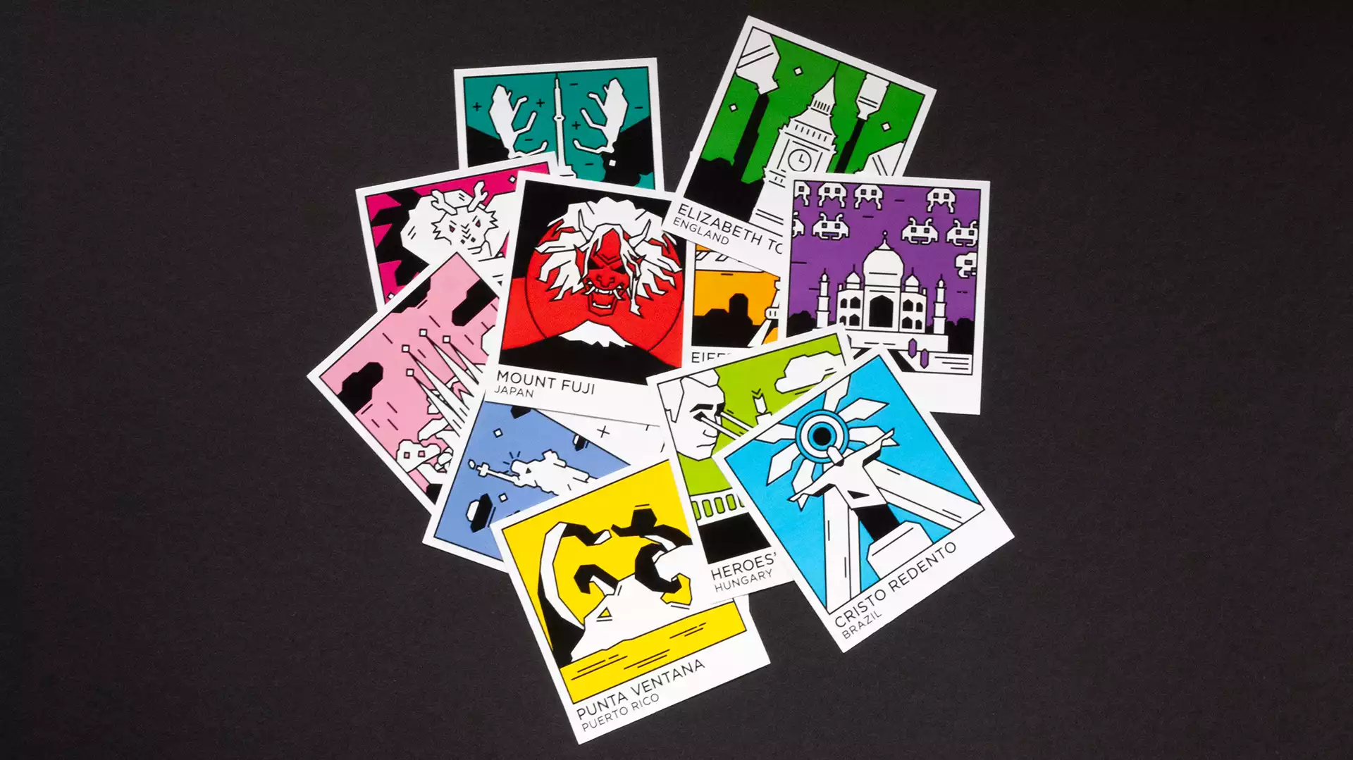A sticker collection with a theme of countries having one of their famous landmarks invaded by fictional or mythical lifeforms.