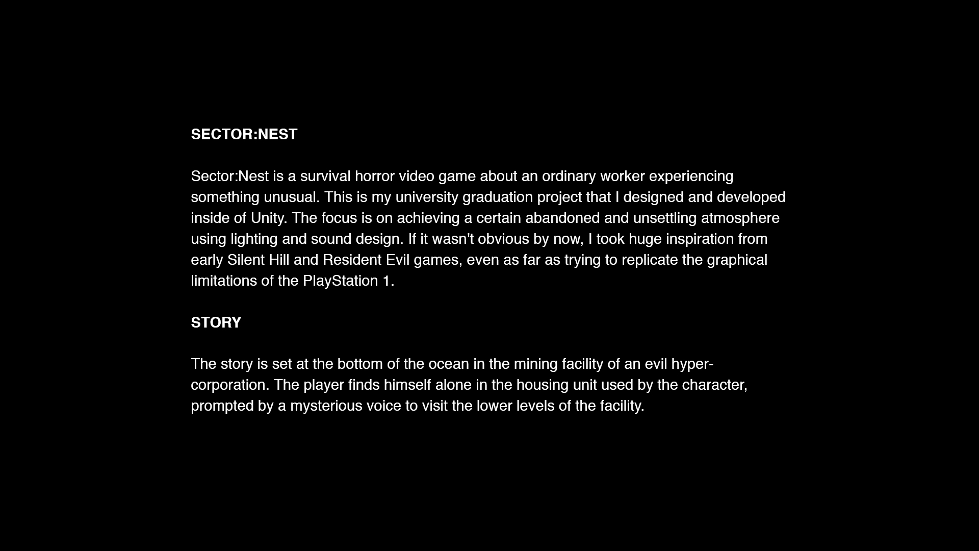 Sector:Nest is a survival horror video game demo about an ordinary worker experiencing something unusual. This is my university graduation project that I designed and developed inside of Unity. The focus is on achieving a certain abandoned and unsettling atmosphere using lighting and sound design.